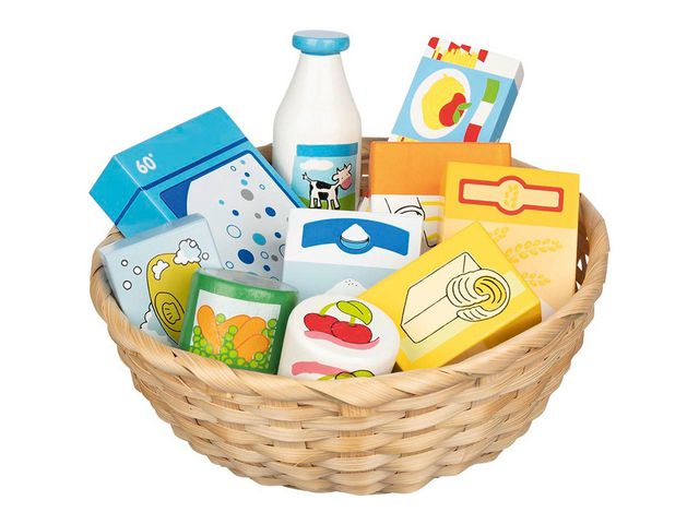Korg med olika matvaror i trä, 10 delar. Härlig korg med matvaror i trä. Stärker bland annat barnens sociala relationer i leken tillsammans med andra barn eller vuxna. – Mått på korgen: 21 cm diameter – Material: Trä – Antal delar: 10 – Rekommenderad ålder: från 3 år – CE