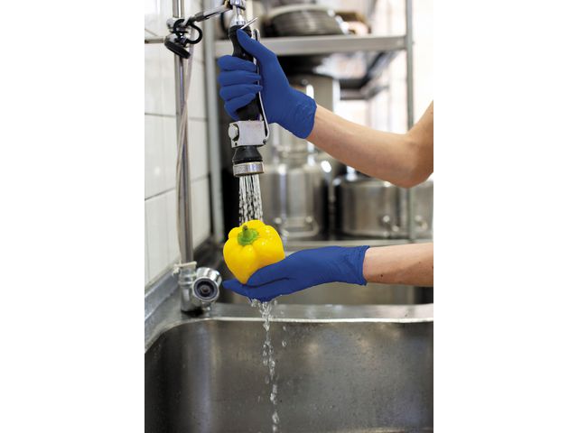 Engångshandskar av lättviktsnitril vilket gör dem extra tunna och elastiska. Godkända för användning i direkt kontakt med alla typer av livsmedel, inklusive livsmedel med hög fetthalt (EN 1186). Puderfria engångshandskar med god fingerkänsla. Med mikroruggad ytstryktur på fingertopparna för bättre grepp. Handskarna är ett bra alternativ till engångshandskar i vinyl. Ej medicinskt godkända. Lämpliga för arbete inom HoReCa, livsmedelsindustri, butik, samt rengöring utan kemikalier: Livsmedelsindustri Fastighetsskötsel Detaljhandel – CE-märkt – AQL: 1,5 – Livsmedelsgodkänd, för användning i direkt kontakt med alla typer av livsmedel, inklusive livsmedel med hög fetthalt (EN 1186) – Silikonfri – Puderfri – Vattenät – Vikt 2.2 ± 0.2g – Ekonomipack, 200 handskar per förpackning – Färg: blå – Storlek: S