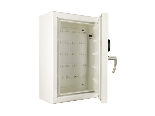 Förvara dina nycklar säkert i ett certifierat nyckelskåp. Inbrottsklass SS3492. Omställningsbart nyckellås – 2 nycklar ingår. Utrustat med nyckelinrede 90 korta krok i rygg. Går att komplettera med ytterligare 83 krok i dörr eller alternativ nyckelinredning. Ange önskemål. Yttermått: 730x550x250 (HxBxD). Innermått: 722x542x180mm (HxBxD)