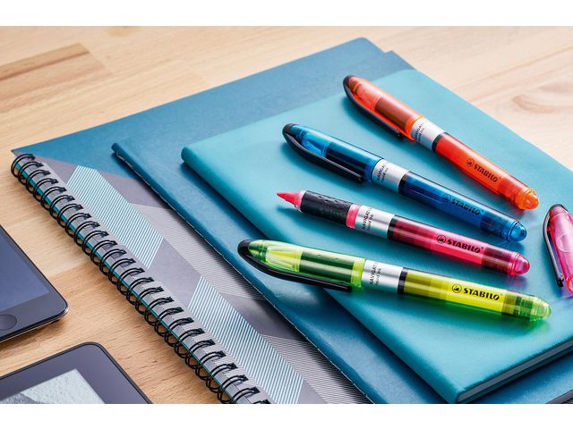 Markera text och viktig information med överstrykningspennan STABILO® NAVIGATOR® som är utrustad med en slimmad transparent pennkropp och en praktisk klämma för när du är på språng. Den eleganta överstrykningspennan STABILO® NAVIGATOR® har en slimmad transparent pennkropp så att bläcket är synligt och kan övervakas samt en mjuk greppzon som gör den bekväm att använda. LUMINATOR® är perfekt för daglig användning av studenter och yrkesverksamma som ofta är i rörelse och den har ett pålitligt vattenbaserat bläck med Anti-Dry-Out-teknik så att korken kan vara av under 4 timmar utan att den torkar ut. Den kan användas på nästan alla typer av papper. Bläcket kommer att appliceras jämnt ända till sista droppen. Den har en robust snedskuren spets som ger dubbla linjebredder på 1 respektive 4 mm så att du kan använda den i många olika sammanhang, till exempel för att skriva, stryka under eller markera. Överstrykningspennan finns i en mängd attraktiva färger och har en praktisk klämma så att du kan ta den med dig. Med huv Snedskuren spets Linjebredd: 1 och 3,5 mm Textfärg: Grön Färg pennkropp: Grön