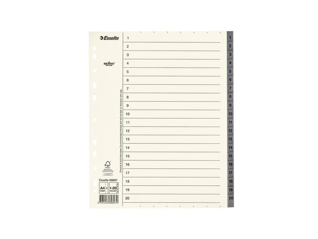 Esselte® Servo förtryckta avdelare ger en enkel och effektiv lösning för att organisera dina dokument i pärmar och mappar. Dessa Esselte®-avdelare är perfekta att använda på kontor och i skolor. De passar utmärkt för organisering av dokument och pärmar. Med omslagsbladet kan du enkelt märka och identifiera innehållet i mappen, medan indexavdelarna har flikar för enkel avdelning och referens. Avdelarna levereras med perforeringar på sidorna och är kompatibla med 2- och 3-ringpärmar. Tillverkas av 110g gultonat papper som är klor och syrafritt. – Förtryckta förstärkta plastflikar, märkt 1–20 – Mått: A4+ (245x3x297) – FSC Mix