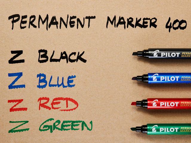Pilots Super Color 400 är en märkpenna med snedställd spets på 4,5mm med en skrivbredd mellan 1,5-4mm. Permanent Marker, märkpennan som skriver på alla material: trä, metall, plast, ja allt. Den är vatten-, ljus-, kyl- och värmetålig och den kan ligga utan huv i 24 timmar och ändå prestera på topp. Finns i fyra färger och två olika versioner, Permanent Marker 100 med konisk spets och Permanent Marker 400 med snedskuren spets för bredare skrift, kalligrafi eller textning. Innehåller ingen xylen eller toulen. – Sned spets – Spetsstorlek: 4.5mm – Linjebredd: 1.5-4.0mm – Vatten- och ljustålig – Kyl- och värmetålig – Permanent bläck – Kan skriva på: plast, trä, kartong, glas, metall m.m. – Kan ligga utan huv 24 timmar