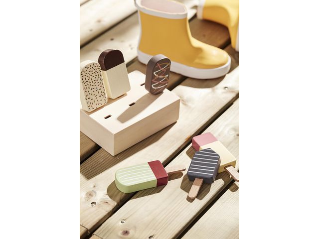 6 st pinnglassar i trä inspirerade av riktiga klassiker. Ställ i trä ingår. – Mått: 14x10x4 cm – Vattenbaserad färg/lack. Material: Bok, schima, plywood – Rekommenderad ålder: från 3 år – FSC – CE