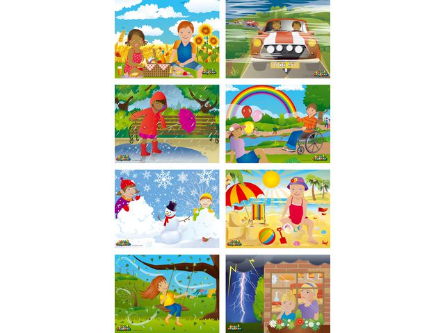 Låt barnen upptäcka vädrets underbara värld med de här pusselsetet som har handskurna pusselbitar som är lätta för små händer att hålla i. Bekanta små barn med vädrets värld med det här pusslet som visar olika slags väderförhållanden. Varje set med åtta pussel innehåller färgglada och handskurna pusselbitar i trä som hjälper barnet att förbättra sina finmotoriska färdigheter och problemlösningsförmåga. Det här unika temat kommer att vara oerhört roligt för små barn och vara skoj i timtal för hela familjen. – Utvecklar finmotoriska färdigheter genom fantasifull lek – Handskurna pusselbitar i trä – 8 pussel med 9–18 pusselbitar – Material: Trä – Mått: 20×15 cm – Rekommenderad ålder: från 3 år – Varning. Lämpar sig inte för barn under 3 år – CE