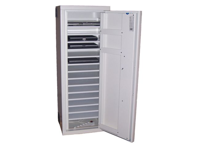Säkerhetsskåp för förvaring av bärbara datorer med bästa skydd mot stöld och skadegörelse. – Inbrottsklassat enligt SS3492 – Självventilerande – Uttagslist för möjlighet till laddning av datorerna i skåpet – Rymmer 14 bärbara datorer – 2 nycklar medföljer – Utvändigt mått: 55 x 150 x 48 cm (BxHxD) – Fackets mått: 42,5 x 6,5 x 40 cm (BxHxD) – Vikt: 215 kg – Frakt tillkommer – Vid beställning kontakta kundtjänst