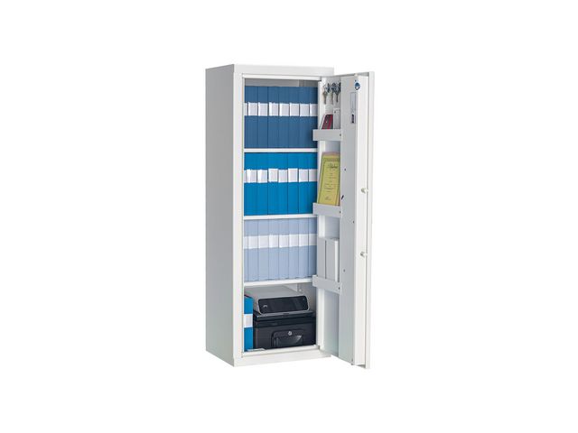 Säkerhetsskåp HÅBECO SSK150B är perfekt för att låsa in t ex laptops, iPads, nycklar och andra värdesaker. HÅBECO SSK150B är ett säkerhetsskåp klassat i SS3492. Levereras med tre hylla och nyckellås som standard. – Elektroniskt kodlås går att få som tillval, art 219773. – Yttermått 1500x550x400 mm (HxBxD) – Innermått 1492x542x320 mm (HxBxD) – Vikt 150 kg