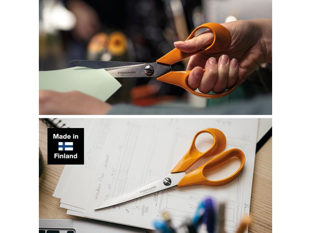 Fiskars klassiska universalsax med justerbar bladspänning som gör att saxen alltid ger dig maximal klipprestanda. Passar för alla former av klipparbeten i hemmet, i skolan och på kontoret. – Längd: 21 cm – Vikt: 83 g – Material: Rostfritt stål – Hårdhet: HRC 57 – Tål maskindisk – Högerhänt