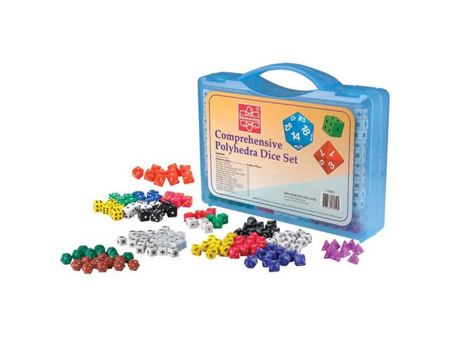 Sats med tärningar som kan sysselsätta en hel klass. Perfekt för t.ex. mattelektionen. Totalt 162 st tärningar av olika slag. Kommer i praktisk väska att förvara tärningarna i. 10 st 0-9 (10 sidor) 10 st 1-10 (10 sidor) 10 st 100-1000 (10 sidor) 10 st 10-100 (10 sidor) 10 st 1000-10000 (10 sidor) 10 st 1-12 (12 sidor) 10 st 1-6 (6 sidor) 30 st pricktärning 1-6 (6 sidor) 12 st svart/vit (6 sidor) 10 st addition & subtraktion (6 sidor) 10 st multiplikation & division (6 sidor) 10 st 1-4 (4 sidor) 10 st 1-8 (8 sidor) 10 st 1-20 (20 sidor) – Tillverkad av: ABS plast – Fri från ftalater – CE-märkt