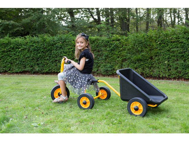 Släp för att koppla till olika cyklar från RABO. Släpet kan användas både med och utan cykel då fixeringsstången har ett handtag i änden. Släpet kan användas med Trehjuling no. 3, Tricart 2000 Rider och Taxi. Samt Trehjuling no. 1 genom att ta loss sadeln och fästa konsolen som medföljer släpet och därefter skruva på sadeln igen. – Mått: (LxBxH) 92 x 46 x 46 cm – Vikt: 6 kg – CE-märkt – Varning. Lämpar sig inte för barn under 3 år