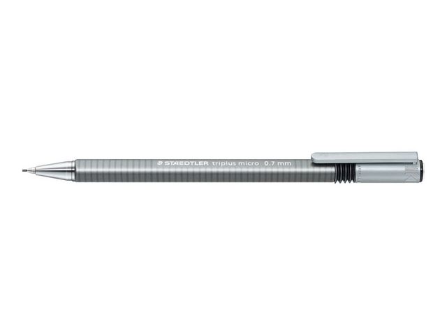 Den mekaniska blyertspennan STAEDTLER triplus® micro 774 har smarta funktioner som ett extra stort radergummi, en skyddande stifthylsa och ergonomisk pennkropp. Den triangelformade kroppen gör den mekaniska pennan enkel att hålla i när man skriver eller ritar. Den har en kork med en fickklämma som döljer ett extra stort radergummi som är PVC- och latexfritt. Den förkromade metallspetsen skyddas av en stifthylsa när den inte används, vilket gör den mekaniska pennan ficksäker. – Klickmekanism – Med suddgummi – Spetsbredd: 0,7 mm – Hårdhetsgrad: B – Färg pennkropp: Grå