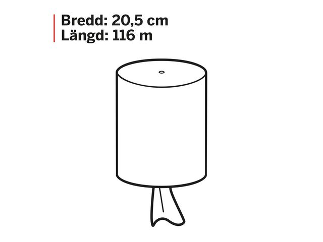 Handtorkrulle av hög kvalitet. Hög styrka för effektiv torkning. Det här sortimentet av handtorkspapper är en kostnadseffektiv men ändå högpresterande lösning för utmärkt hygien och renlighet på arbetsplatser. Standardpappret med 1 lager är mjukt och skonsamt mot huden samtidigt som det har bra uppsugningsförmåga. Pappret är oparfymerat och löses snabbt upp, vilket gör det till en miljövänligare produkt som är Svanenmärkt. Pappret är septiskt säkert och lämpligt för alla vvs-utrymmen, vilket ger dig flexibilitet och trygghet. De återvunna fibrer som produkten är tillverkad av ger skonsam men ändå högpresterande resultat med varje användning och löses snabbt upp fullständigt i vatten. Lämplig för låg till medelhög förbrukning i alla offentliga miljöer. Fiberråvara: återvunna fiber och nyfiber. Sammansättningen styrs av produktkrav samt tillgång och kvalitet för optimal användning av råvaran. – 1-lagers, vit – Utan hylsa – Oparfymerad – Uppfyller: ISO 9001, ISO 14001 – Längd per rulle: 116m – Diameter: 130mm – Bredd: 205mm – Material: 75% återvunna fiber och nyfiber – Livsmedelsgodkänd – Svanen: licensnummer 30050006