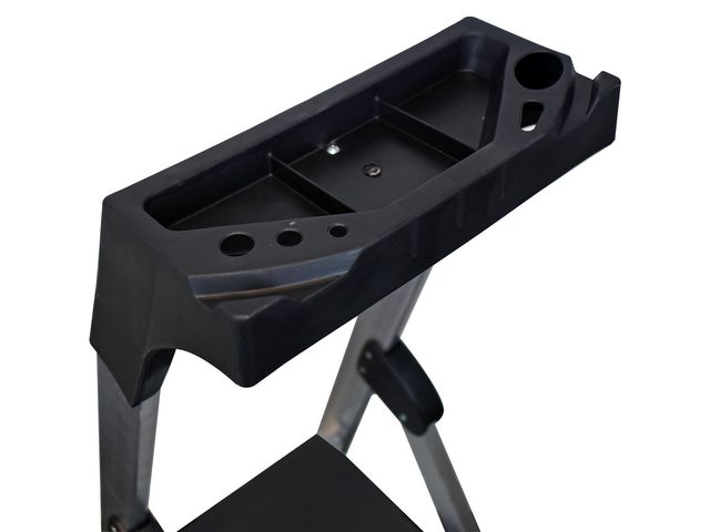 En mångsidig och säker 3-stegs trappstege Robust aluminiumstruktur som garanterar hållbarhet och lång livslängd. Praktiskt verktygshållare med stängningsfunktion för att hålla dina verktyg lättillgängliga och säkra. Halkfria räfflade steg och säkerhetsräcke för maximal säkerhet vid varje kliv. Halksäkra glidytor för stabilitet och säkerhet på alla underlag. Imponerande maximal lastkapacitet på 150 kg, vilket gör den idealisk för både professionell och privat användning. – 3 steg – Höjd: 136 cm – Djup: 13 cm – Plattformshöjd: 62 cm – Bredd: 44 cm – Max belastning: 150 kg – Material: aluminium
