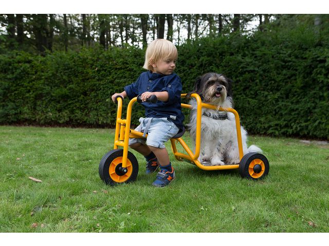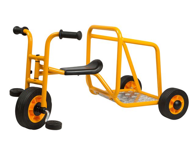 RABO Trehjuling Taxi med ståbräda är en trehjuling med plats för två. Trehjulingen passar barn mellan 1-4 år. Cykeln låter barnen interagera med varandra i social och fantasifull lek. Trehjulingen har två platser vilket gör att två barn samtidigt kan leka på den samtidigt som de interagerar med varandra i lek och rollspel. Med RABOs taxicykle kan barnen åka över hela världen, eller bara över till lekstugan. Mått: (LxBxH) 88 x 51 x 48 cm Säteshöjd: 27 cm Vikt: 10 kg – Varning. Lämpar sig inte för barn under 3 år – CE-märkt