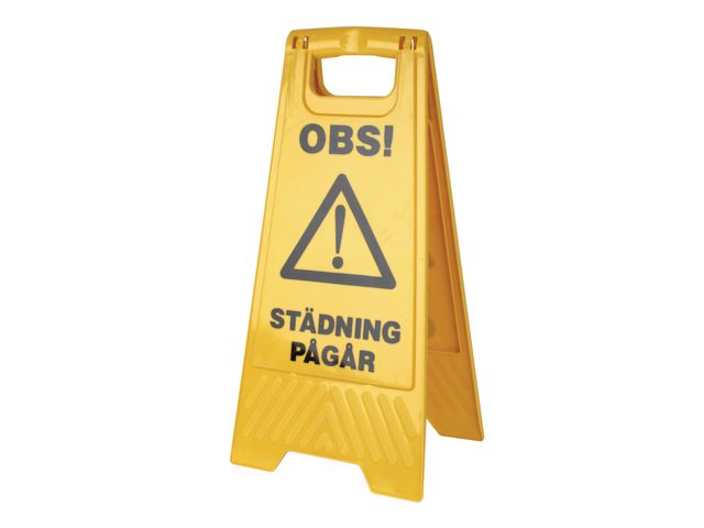 Skylt för avspärrning av områden vid till exempel golvvård eller slaskigt väder. På ena sidan ’Våta golv’ på andra sidan ’Städning pågår’.