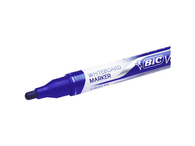 Den här BIC® Velleda® whiteboardpennan har flytande bläck som ger fin skrift på alla whiteboardytor. Dessa BIC® Velleda® whiteboardpennor har en särskild flytande bläckteknik som gör att de håller längre än de flesta BIC® Velleda® märkpennor. Det avtorkningsbara bläcket har en suverän suddförmåga, vilket gör dem perfekta för användning hemma, på kontoret eller i klassrummet. Bläcket är svagdoftande och alkoholbaserat, så det besvärar inte användaren. Det finns även ett bläcknivåfönster så att du kan övervaka användningen. – Rund spets – Linjebredd: 2,2 mm – Textfärg: Blå – Färg pennkropp: Vit (Huv i textfärg)