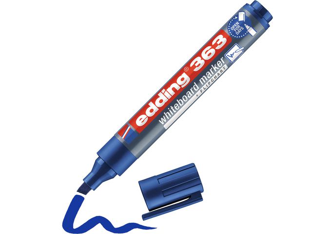 Whiteboardmärkpennan Edding 363 innehåller ett luktfritt pigmentbläck och kan användas på alla whiteboardtavlor och andra icke-porösa ytor. Den här märkpennan är speciellt utformad för användning på whiteboardtavlor och nästan alla icke-porösa ytor, till exempel emalj, glas och melamin. Det snabbtorkande och ljusbeständiga bläcket kan enkelt torkas bort. Märkpennan innehåller ett torksäkert bläck som – Icke permanent bläck – Med huv – Snedskuren spets – Linjebredd: 1 – 5 mm – Textfärg: Blå – Färg pennkropp: Svart/Grå